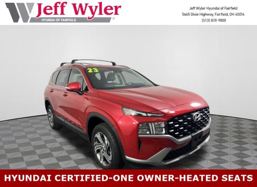 CARFAX One-Owner. Clean CARFAX. Jeff Wyler Hyundai of Fairfield is excited to offer this fantastic 2023 Hyundai Santa Fe SEL in Calypso Red. Well equipped with: Option Group 01, Hyundai Certified Used Vehicles Certified, AWD, Black Cloth, Android Auto, Apple CarPlay, CALL NOW FOR YOUR VIP APPOINTMENT 513-870-9800, FULLY SERVICED w/RECORDS, GUARANTEED FINANCING!! NO MATTER YOUR SITUATION WE CAN GET AN APPROVAL!!, THE #1 Volume dealer in the region! Come see why for yourself Today!!, WE PAY MORE FOR YOUR TRADE!!, 18" x 7.5J Alloy Wheels, 4-Wheel Disc Brakes, 6 Speakers, ABS brakes, Air Conditioning, Alloy wheels, AM/FM radio: SiriusXM, Apple CarPlay & Android Auto, Auto High-beam Headlights, Automatic temperature control, Axle Ratio: 4.081, Brake assist, Bumpers: body-color, Cargo Net, Carpeted Floor Mats, Delay-off headlights, Driver door bin, Driver vanity mirror, Dual front impact airbags, Dual front side impact airbags, Electronic Stability Control, Emergency communication system, Exterior Parking Camera Rear, First Aid Kit, Four wheel independent suspension, Front anti-roll bar, Front Bucket Seats, Front Center Armrest, Front dual zone A/C, Front reading lights, Fully automatic headlights, Heated door mirrors, Heated Front Bucket Seats, Heated front seats, Illuminated entry, Leather steering wheel, Low tire pressure warning, Navigation System, Occupant sensing airbag, Outside temperature display, Overhead airbag, Overhead console, Panic alarm, Passenger door bin, Passenger vanity mirror, Power door mirrors, Power driver seat, Power Liftgate, Power steering, Power windows, Radio: AM/FM Display Audio, Rear anti-roll bar, Rear seat center armrest, Rear window defroster, Rear window wiper, Remote keyless entry, Roof Rack Cross Bars (DISC), Security system, Speed control, Speed-sensing steering, Split folding rear seat, Spoiler, Stain-Resistant Cloth Seat Trim, Steering wheel mounted audio controls, Tachometer, Telescoping steering wheel, Tilt steering wheel, Traction control, Trip computer, Turn signal indicator mirrors, and Variably intermittent wipers. Certified. Hyundai Certified Used Vehicles Details: * 173+ Point Inspection * Powertrain Limited Warranty: 120 Month/100,000 Mile (whichever comes first) from original in-service date * Warranty Deductible: $50 * Roadside Assistance * Vehicle History * Limited Warranty: 60 Month/60,000 Mile (whichever comes first) from original in-service date * Includes 10-year/Unlimited Mileage Roadside Assistance with Rental Car and Trip Interruption Reimbursement; Please See Dealers for Specific Vehicle Eligibility Requirements. 10-Year/100,000 Mile Hybrid/EV Battery Warranty. 3-Months SiriusXM Trial Subscription. Complimentary 1 Year (Connected Care & Remote Pkgs).TO CHECK ON THE AVAILABILITY OF THIS VEHICLE REACH OUT TO ONE OF OUR TEAM MEMBERS!! ALSO SHOP ONLINE AT https://www.jeffwylerhyundaioffairfield.com/ Proudly Serving: Cincinnati, Dayton, Columbus, Louisville, Lexington, Indianapolis, Hamilton, Florence, Alexandria, Beavercreek, Springdale, West Chester, Monroe, Fairfield, Kenwood, Newport and all of greater Cincinnati Ohio, Indiana, and Northern Kentucky.